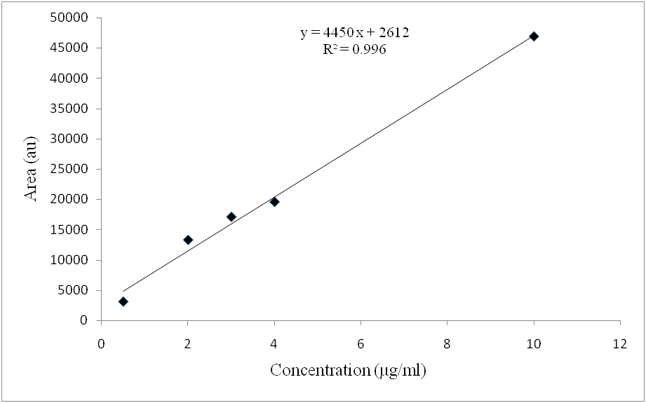 The standard calibration curve was constructed to obtain a regression line equation to be used for finding out the concentration of drug in samples. Two calibration curves of the drug were plotted; one by RP-HPLC method and one by UV spectrophotometer.2 Calibration curve by RP-HPLC method was used for assay of drug in gel matrix for entrapment efficiency studies. The other one was plotted by UV spectrophotometer using Ethanolic phosphate buffer (pH 7.4) for carrying out in vitro drug release studies [12].