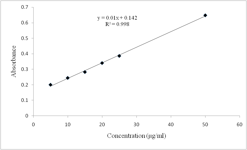 To make a stock solution, accurately weighed 1.0 mg of Maslinic acid was dissolved in Ethanolic phosphate buffer (7.4) in 10 ml volumetric flask and volume were made up to the mark with Ethanolic phosphate buffer (7.4) to give a clear solution of 1000 µg/ml concentration. It was further diluted to obtain a secondary stock solution of 100 µg/ml. A series of different concentrations of drug were prepared from secondary stock solution i.e. 0.5, 1.0, 1.5, 2.0, 2.5 and 5.0 ml solutions were pipette out from secondary stock solution and were transferred in to 10 ml volumetric flasks to obtain a solution of 5, 10, 15, 20, 25, 50 µg/ml respectively on making up the solution to 10 ml with Ethanolic phosphate buffer (7.4).