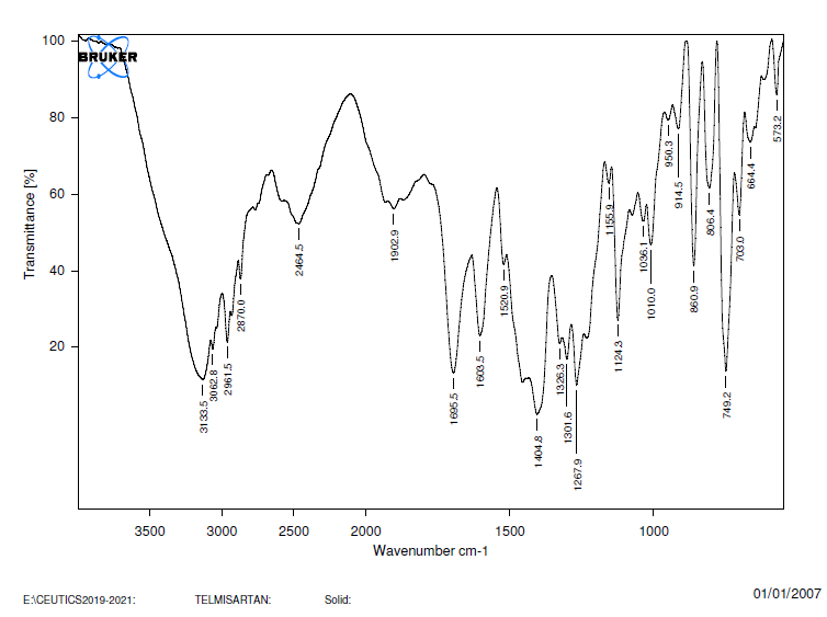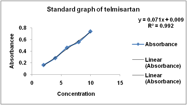 An accurately weighed amount of 10 mg Telmisartan was transferred into a 10 ml volumetric flask, few drops of methanol were added to dissolve the drug then the volume was made up to the mark with methanol. From this, necessary dilutions were made to give concentrations. The absorbance of the solution was recorded at ʎmax of 295 nm by using the Photometric method.