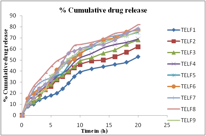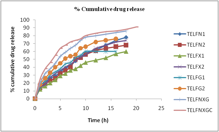 The drug release was carried out among all the formulations; the drug release was maximum was found in the TELFNXGC formulation it was for about 20 h with 91.58%.