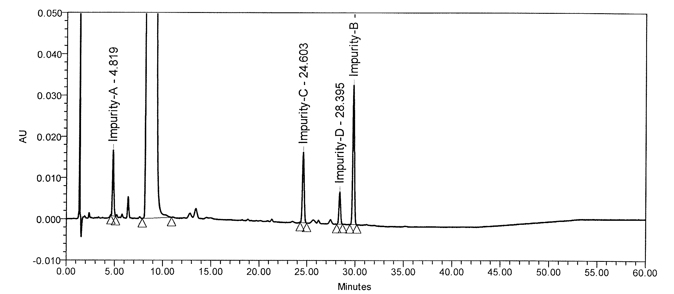 Inertsil ODS3V (150 x 4.6) mm, 5 µm column was used. The column holder temperature maintained at 40 °C. The mobile phase consist of a different composition of buffer solution and organic solvents. Mobile Phase-A is mixture of Water, Acetonitrile and Trifluroacetic acid in the ratio 80:20: 0.1 v/v/v and pH of this mixture adjusted to 2.0 with dilute potassium hydroxide solution.