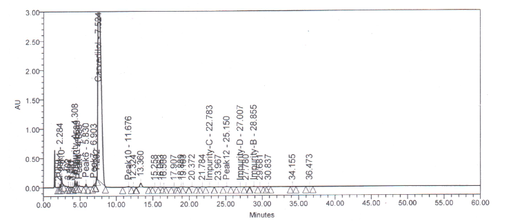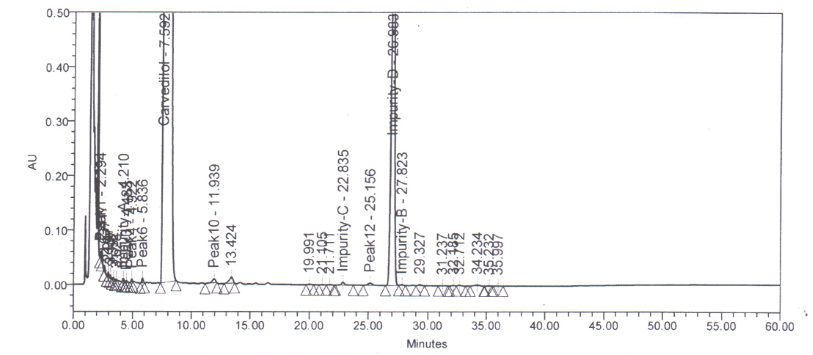 The Force degradation study (stress study) revealed that all the peaks i.e. Carvedilol peak, known impurities, unknown impurities and degradants, are well resolved from each other which is visiblyconfirmedin fig. 11 and fig. 12.