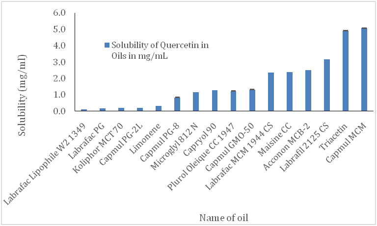 In case of oils, the solubility of Quercetin was found in Capmul MCM>Triacetin>Labrafil 2125 CS>Acconon MCB-2>Maisine CC>Labrafac MCM 1944 CS and was found to be more than 2 mg/ml.