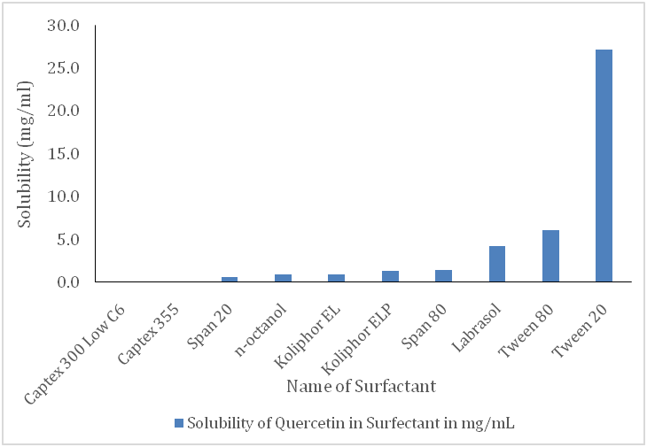 In case of Surfactants, the solubility of Quercetin was found in maximum in the case of Tween 20, followed by Labrasol ranging from 4.232±0.005 to 27.078±0.133 mg/ml.