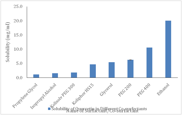 In case of Co-surfactants, the solubility of Quercetin was found in maximum in case of Ethanol, followed by PEG 400 and PEG 200 ranging from 6.229±0.002 to 20.000±0.030 mg/ml.