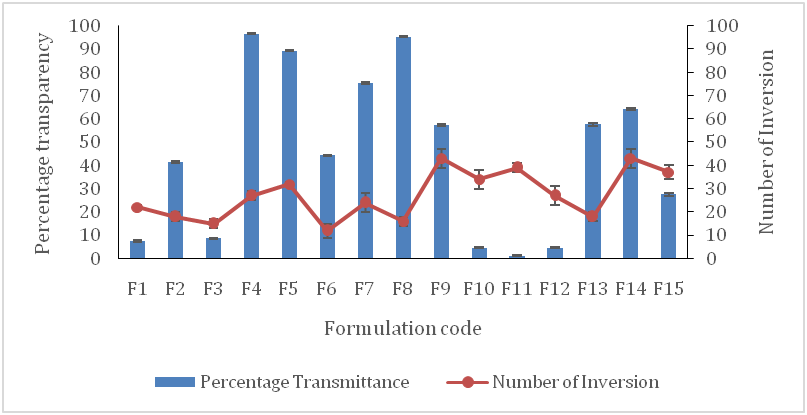 The mixtures containing selected oils and surfactants were gradually heated at 50 ℃ for homogenization of the components. Each mixture was then diluted with distilled water to 100 ml in a stoppered conical flask. Ease of emulsification was judged by the number of flask inversions required to yield homogenous emulsion. Emulsions were allowed to stand for 2 h and their % transmittance was evaluated at 638 nm by UV-Visible spectrophotometer (UV1800, Shimadzu, Japan) using distilled water as a blank. Emulsions were furthermore observed visually for any turbidity or phase separation [9].
