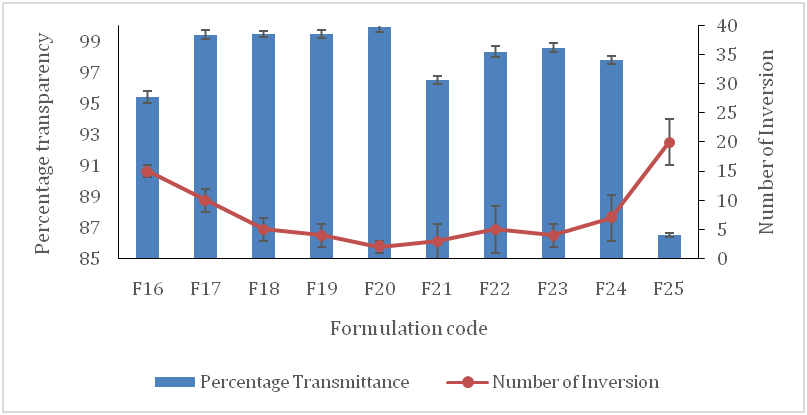 The mixture were further subjected to emulsification study with the addition of different co-surfactant (PEG 200, Koliphor HS15, PEG 400, Glycerol and Ethanol) with each of the selected mixture in the ratio oil: surfactant: co-surfactant ie 3:2:2 to produce formulations F16 to F25. It was found that the transmittance (fig. 6) was to be maximum in case of F20, where Ethanol was used as a co-surfactant with Triacetin (oil) and tween 20 (surfactant). Furthermore, it didn’t show any evident turbidity and phase separation.