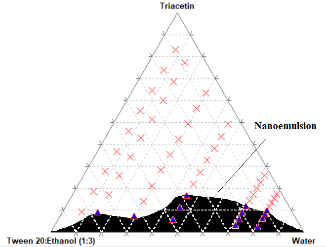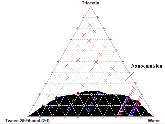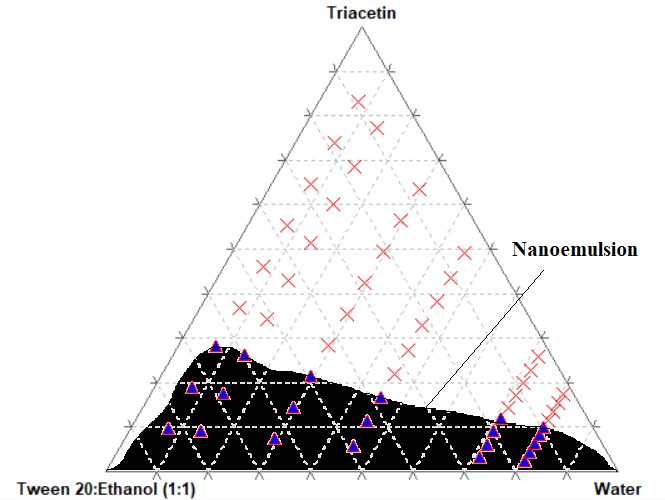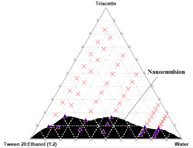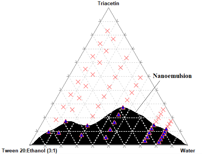 Phase diagrams involve plotting the three components oil (triacetin), surfactant: co-surfactant (Smix i.e., tween 20: ethanol) and water content, each of them representing an apex of triangle. The required amounts of the components (oil and Smix) were weighed accurately and then sonicated for 3 min. The mixture was then gently heated at 45–50 °C and vortex to form a homogenous mixture. To this mixture, distilled water was added drop by drop until a transparent solution was formed. The surfactant and co-surfactant (Smix) were varied in mass ratios 1:1, 1:2, 1:3, 2:1 and 3:1. Pseudo ternary mixtures were formed in these ratios and then the quantity of water forming transparent solution was plotted with other components in the pseudo-ternary phase diagram [11].