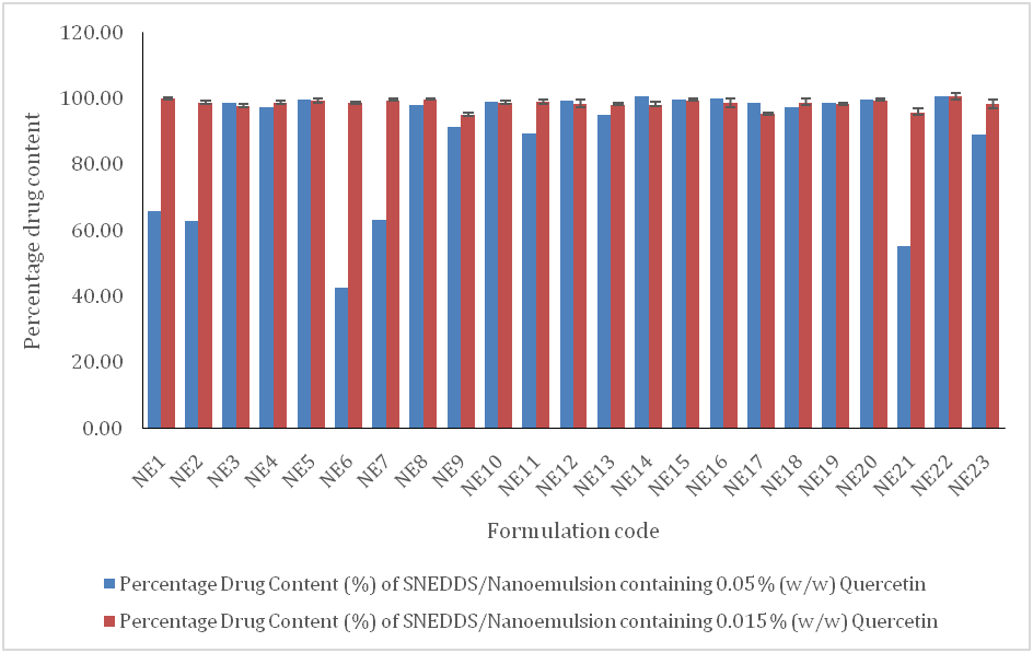 Conclusion: A stable SNEDDS of Quercetin was developed, and results indicated substantial enhancement in the dissolution of the drug when formulated as a self-nano emulsifying drug delivery system, indicating its potential to enhance oral solubility and bioavailability of the drug.