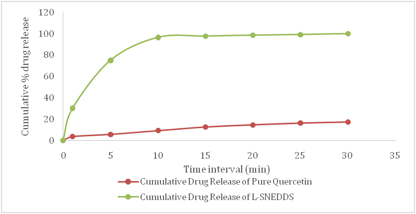 The in vitro release of the drug from the optimized SNEDDS of Quercetin (NE4) revealed a significant increase drug release rate of formulation than the pure drug. The data of drug release of 30 min have shown maximum drug release (99.70±0.227%) of Quercetin from its SNEDDS. Furthermore, the release profile of Quercetin from its SNEDDS also showed that it yielded an immediate release profile.