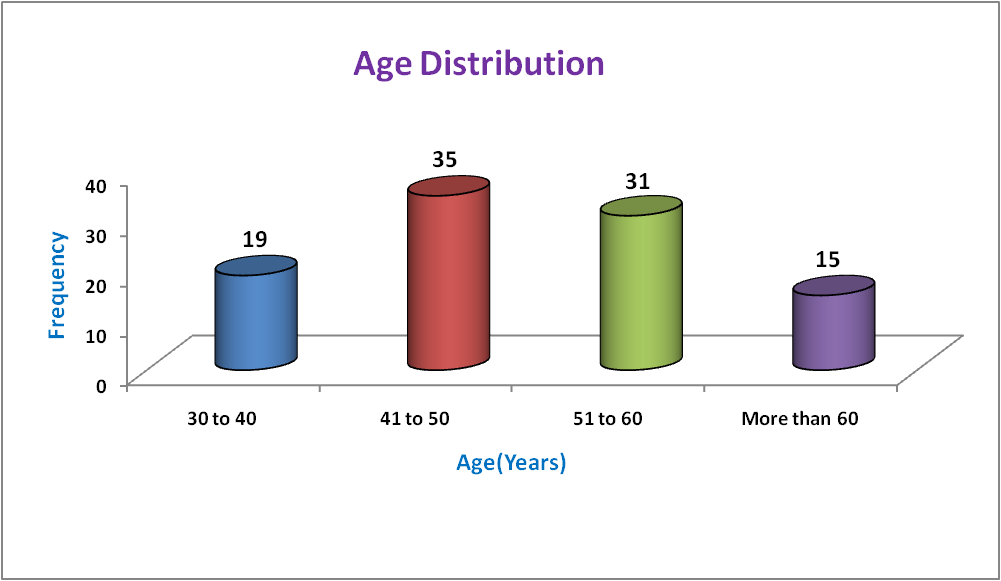 Among 100 patients taken in the study, 54% were males and 46% were females, indicating a high prevalence in males according to our study. The mean age of the subjects recruited in the study was 50.84. The maximum percentage of age group enrolled were of 41-50 y group[35%], later comes 51-60 y group[31%]followed by 30-40 y group and more than 60 y group with 19% and 15% respectively. In our present study results are similar with the study conducted by Devarajan et al. [15] and T Nishanth et al. [16].
