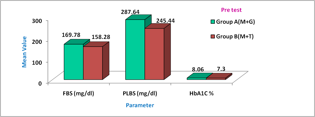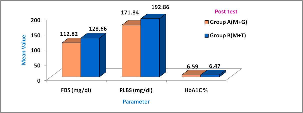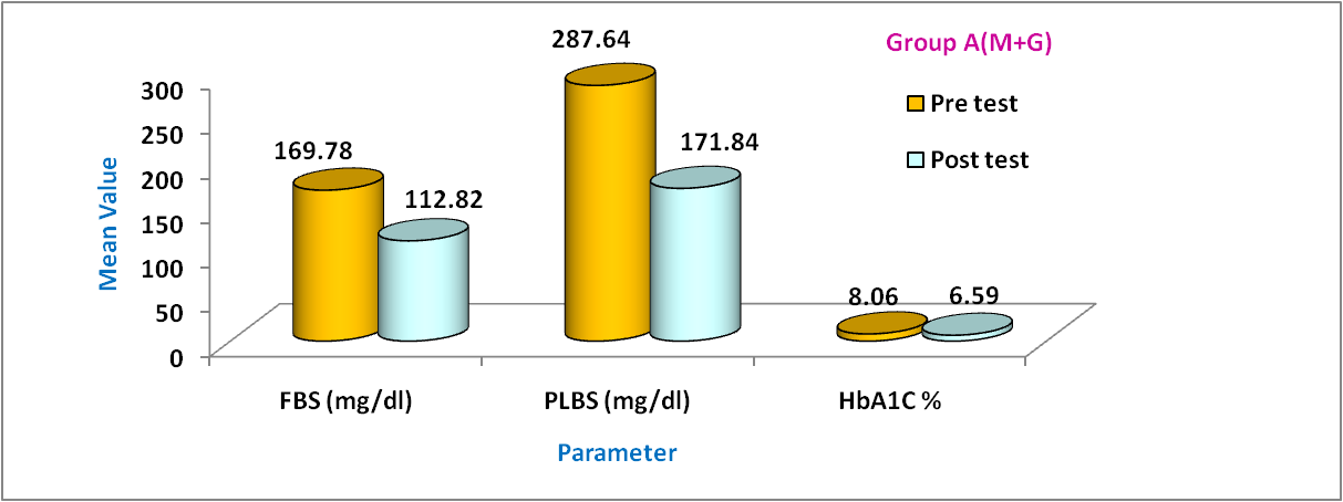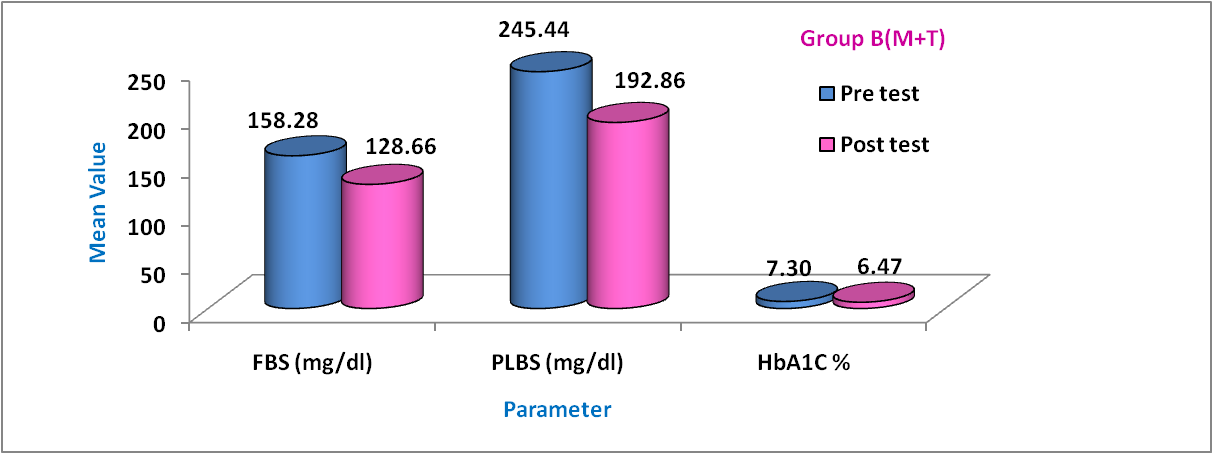 Results: The mean difference values of HbA1c pre-treatment and post-treatment of Group A were calculated as 1.47 and of Group B was 0.83. The mean difference values FBS pre-treatment and post-treatment of Group A were found to be 56.96 and Group B was 29.62. The PLBS mean difference at Pre-treatment and Post-treatment of Group A and Group B was obtained to be 115.8 and 52.58, respectively.