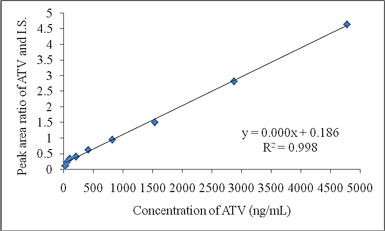 Results of the intra-day and inter-day validation assays for ATV and ATL are presented in table 1. The inter-and intra-day precisions were ≤5.86 and ≤4.80, whereas the inter-and intra-day accuracies were in the range of 93.90-102.57% and 96.16-98.78%, respectively, for ATV. Results of the inter-and intra-day precisions were ≤5.07 and ≤3.95, whereas the inter-and intra-day accuracies were in the range of 96.35-102.09% and 96.56-98.32%, respectively, for ATL. Both precision and accuracy were within the acceptable ranges for bioanalytical purposes. The assay method demonstrated a high degree of accuracy and precision.