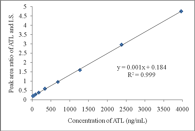 A nine-point standard calibration solution of ATV and ATL were prepared by spiking blank plasma with appropriate amounts of analytes in rabbit plasma to yield final concentrations of 22.08, 50.97, 101.94, 203.88, 407.76, 815.91, 1529.08, 2867.04, and 4778.37 ng ml-1 for ATV and 18.35, 42.34, 84.68, 169.35, 338.71, 677.41, 1270.14, 2381.52, and 3969.20 ng ml-1 for ATL. Three quality control (QC) samples were prepared at three concentration levels of 101.94, 407.75, and 1529.08 ng ml-1 for ATV and 84.68, 338.71, and 1270.14 ng ml-1 for ATL. Calibration curves were plotted with a peak area ratio of drug and I. S. on the Y-axis and concentration on the X-axis.
