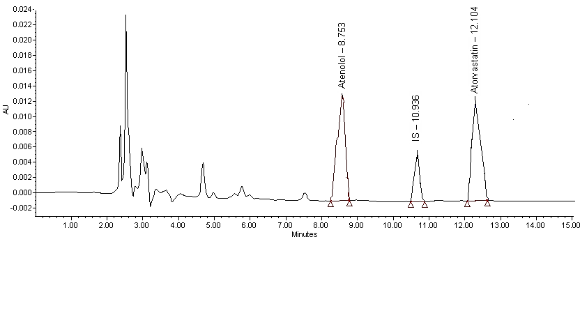 The chromatographic system described above allows good resolution of ATV, ATL, and I. S. peaks. At a flow rate of 1.0 ml min-1, ATL, I. S., and ATV retention times were 8.7, 10.9, and 12.1 min, respectively. The optimum wavelength for detection was 248 nm,at which a good detector response was obtained. Representative chromatograms obtained from blank plasma and plasma spiked with ATV and ATL are presented. As shown in these fig. 2a and 2b, ATV, ATL, and I. S. were eluted, forming symmetrical peaks and well separated from the solvent front. No endogenous components from plasma were found to interfere with the elution of the analytes or I. S.