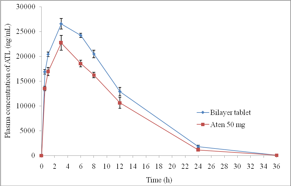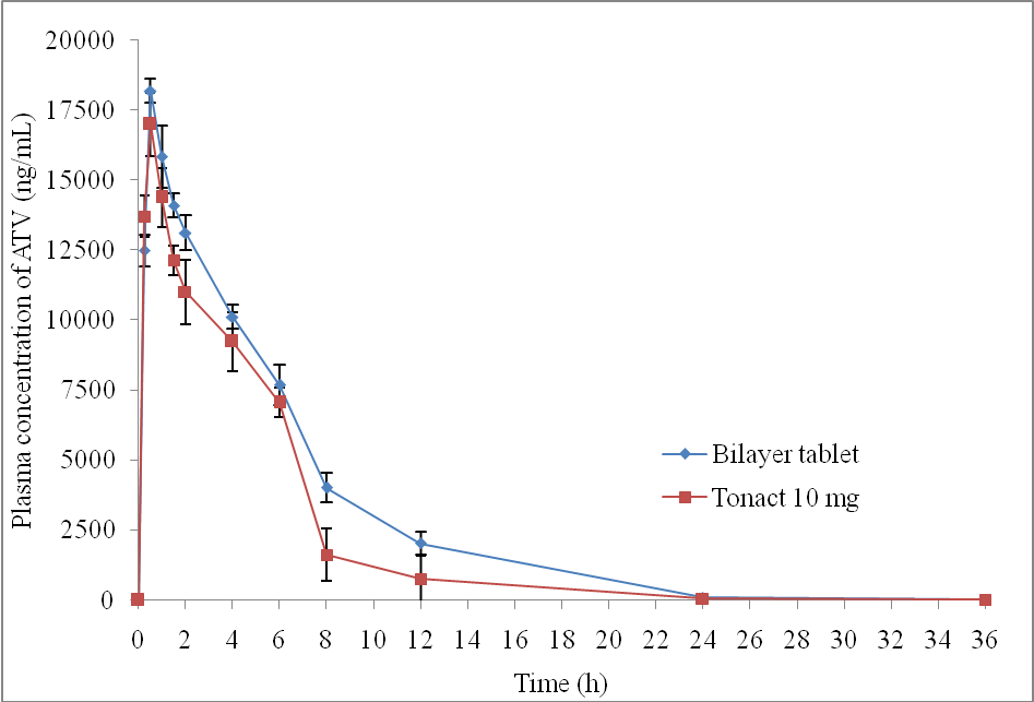 The pharmacokinetic studies were conducted under the Institute Animal Ethics Committee of the Indian Institute of Chemical Biology, Kolkata, India. Healthy rabbits (New Zeland albino) of either sex weighing 2.5-3.0 Kg were involved in the experiment. After a 12 h fast, all rabbits were divided into three groups, and each group contained six rabbits. The conventional ATV marketed tablet (Tonact 10 mg), sustained-release ATL marketed tablet (Aten 50 mg), and bilayer tablet prepared in our laboratory contained 10 mg ATV as a fast-release layer and 50 mg of ATL as sustained-release layer were administered in three groups. Blood sampling was carried out at suitable time intervals up to 36 h. The total area under the plasma concentration-time curve (AUC0-∞), the maximum plasma concentration (Cmax), and the time to reach the maximum plasma concentration (Tmax) were chosen as parameters for pharmacokinetic evaluation. The Cmax and Tmax were obtained directly from the plasma concentration vs. Time [21]. AUC0-∞ was obtained by adding the AUC0-36 h, which was calculated by the linear trapezoidal method and the area from the last experimental time point to infinite time (AUC36 h-∞) using the technique of Shargel and Yu [22]. The student’s t-test was used for statistical analysis of the data, and a probability value of P<0.05 was considered statistically significant.