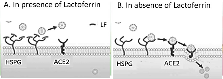 Lf has been found tentatively to repress viral section by restricting to have cell surface HSPGs in murine Covid [70] just as human Covid hCoV-NL63 [62] and pseudotyped SARS-CoV [63]. There are at this point no distributed examinations on the impacts of Lf on SARS-CoV-2 and its entrance into have cells. By the by, given the as of now acknowledged 'viral surfing' model for the job of cell surface HSPGs [64], which the attacking virion particles 'surf' from low-proclivity HSPG mooring destinations to high-liking section receptors in an intrusion, along with the homology of SARS-CoV and SARS-CoV-2 spike protein structures, just as both infections relying upon a similar angiotensin-changing over catalyst 2 (ACE2) receptor for cell passage [65], we have a solid sense of reassurance to hypothesize a comparative component by which HSPGs fill in as SARS-CoV-2 connection locales that assemble the infection on the phone surface and work with explicit passage receptors like ACE2. All things considered, Lf can restrain SARS-CoV-2 intrusion at micromolar fixations and in a portion subordinate way similarly as on account of SARS-CoV [63]. More pertinent to our theory are the new outcomes detailed by Serrano et al. that a liposomal ox-like Lf supplement containing 32 mg of Lf directed at four to six dosages each day for 10 d with zinc 10 mg a few times every day brought about 100% recuperation of 75 suggestive SARS-CoV-2-positive patients inside 4–5 d, and a similar treatment at lower portion seemed to forestall the disease in sound contacts [66]. Since one more significant part of Lf bioactivity identifies with its immunomodulatory and calming capacities, on account of viral contaminations specifically, it might frequently be the size of immune reaction and irritation that adds to infection cut off ity, and this is especially important for COVID-19. Current reasoning recommends that mortality from COVID-19 isn't just because of viral contamination however is an aftereffect of a cytokine storm condition in select patients related with hyper inflammation prompting intense respiratory misery and resulting mortality [67]. A cytokine profile in extreme COVID-19 cases is portrayed by in-wrinkles in cytokines and intense stage reactants like interleukin 6 (IL-6), cancer corruption factor-alpha (TNF α) and ferritin. In such manner, Lf is shown to diminish IL-6 and TNF α [68] and to down-regulate ferritin in test settings reproducing sep-sister. On the off chance that the theory that Lf can tweak an overactive resistant and fiery reaction to viral disease is right, then, at that point, Lf could be an up-and-comer subordinate treatment for more extreme instances of COVID-19. 3.