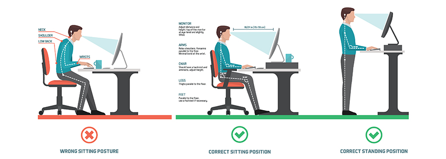 Seating: Seats should be well-fitted and comfortable. The height of the seat should be adjusted so that the feet sit flat on the floor. Weapons should be adjusted to provide support while typing and the wrists should not remain on the keyboard when typing.