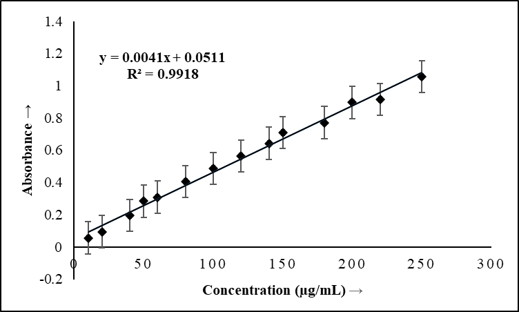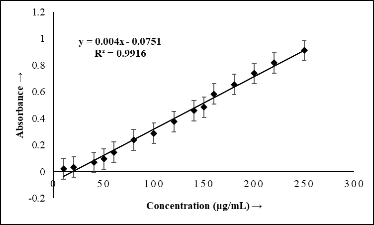A standard calibration curve was constructed by plotting the absorbance against the concentration of GLZ. The statistical parameters were given in the regression equation calculated from the calibration curve y = a+mx, where y is the absorbance, x is a concentration of GLZ in µg/ml, m is slope and a is the intercept on y-axis. The linearity was calculated by the least square regression method. The linearity of the calibration graph was proved by high value of correlation coefficient (R2) and small value of the y-intercept of the regression equation. The linearity range of the calibration curve was found to be limiting in the range for Method-A from 30 to 200 µg/ml and for Method-B from 70 to 230 µg/ml concentration of GLZ. The molar absorptivity and Sandel’s sensitivity of the resulting color complex was calculated and found to befor Method-A0.1326 x 104 L/mol/cmand0.2102µg/cm2and for Method-B 0.1294x 104 L/mol/cm and 0.3709µg/cm2 (table 1).