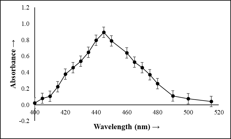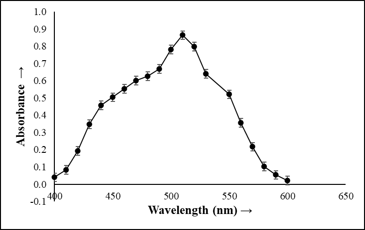 The resultant purple and orange color complex were shows a maximum wavelength of absorbance (λmax) at 510 and 445 nm in visible spectrum. This colored complex formed was stable for more than 24 h.