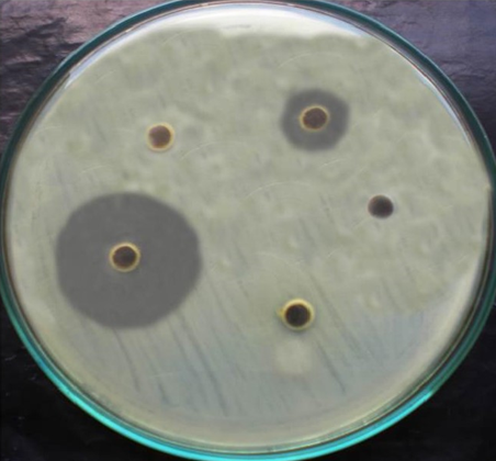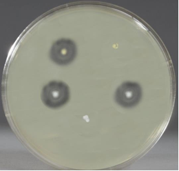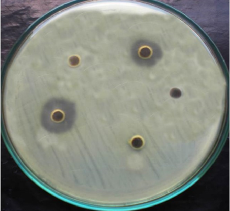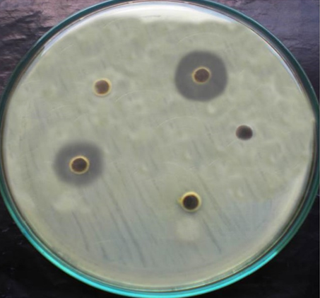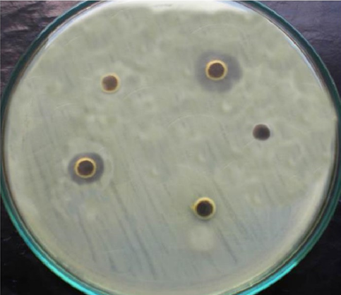 The overnight grown cultures of the clinical pathogens in Zobell Marine Broth were used to swab uniformly on the surface of the ZMA plates using sterile cotton swabs. The marine isolates from the agar slants were spotted onto Zobell Marine Agar plates seeded with actively growing cells of clinical pathogens. The plates were incubated for 24 h at 37 °C. After the incubation period, the plates were observed for zone of inhibition and the results were recorded.