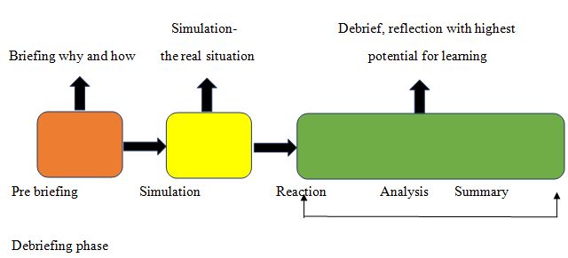 Debriefing phase: Debriefing is the heart and soul of simulation-based training. Debriefing is defined as an after-event discussion regarding the performance and thought process of the team during the scenario to promote reflective learning and improve clinical performance.