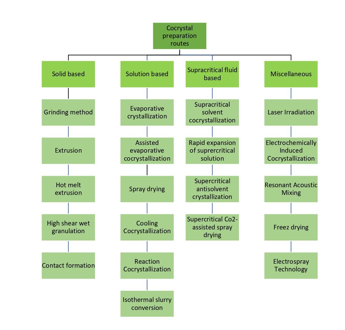 Some cocrystal preparation routes are classified here as solid-based, solution-based, supercritical fluid-based, and miscellaneous shown in fig. 1.