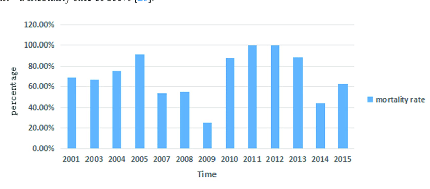An outbreak of NiV infection occurred in the Philippines in 2014. 17 cases were confirmed, the case fatality rate was 82%. 10 patients had a history of close contavt with horses or of horse meat consumption. Deaths of 10 horses were reported in the same time period, of which 9 showed neurologicalsymtoms. However, samples from horses were not tested for NiV.5 patients, including 2 healthcare personnel, acquired the disease through person-to-person transmission. This strain was closely related to the Malaysian strain where definite person to person spread had not been previously identified. This suggests the possibility of co-evolution of different strains of NiV in bats or of strain mutation as the likelihood of mutation increases with each spillover event [27].