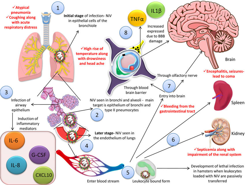 From the respiratory epithelium, the virus is disseminated to the endothelial cells of the lungs in the latter stage of the disease. Subsequently, the virus can gain entry into blood stream followed by dissemination, either freely or in host leukocyte bound form. Apart from lungs, spleen and kidneys along with brain may act as target organs leading to multiple organ failure. There is development of lethal infection in hamsters when leukocytes loaded with NiV are passively transferred. In pigs, there is productive infection of monocytes, natural killer (NK) cells along with CD6+, CD8+T lymphocytes [30].