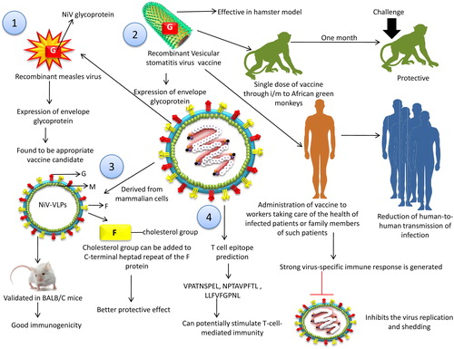 A recombinant measles virus (rMV) vaccine that expresses envelope glycoprotein of NiV has been found to be promising for use in man. a replication–competent, recombinant VSV-vectored vaccine encoding NiV glycoprotein was reported to show high efficiency in a hamster model. A single intramuscular dose of the vaccines conferred protective immunity in African green monkeys one month after vaccination. Healthcare workers and family contacts attending Nipah cases should be considered for Nipah vaccination, in order to limit human-to-human transmission. A very strong virus-specific immune response is generated through vaccination which inhibit the virus replication and shedding. Such vaccine could provide from niV in disease outbreak. Attenuated live vaccines as well as subunit G (recombinant platforms) have also been tested [36].