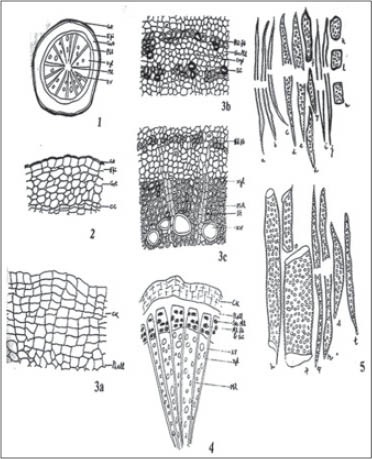 Fig. 2: (2.1) T. S. of young root (2.2) T. S. with cellular detail and cork cambium (2.3) T. S. of mature root showing cellular detail with phelloderm, phelloderm with secondary phloem, secondary phloem, and xylem (2.4) T. S. of mature root (2.5) Phloem fibers with pits, stone cells, xylem vessels, tracheidal fibers, tracheides, xylem fibers, xylem parenchyma [8]