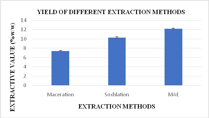 The yields of the different extraction methods are given in table 1 and graphically represented by fig. 1, which reveal that the extractive values of MAE were found to be much higher compared to the other two methods and the time taken by MAE (3 min) is much lower than that of maceration (72 h) and soxhlation (3 h). Therefore, MAE was found to be the most efficient extraction method in terms of yield and time when compared to the other conventional methods performed.