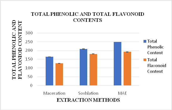 The value of total phenolic and total flavonoid contents in extracts of C. ternatea leaves obtained by different extraction methods is shown in table 2 and graphically represented by fig. 2.