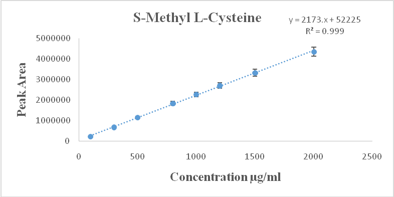A calibration curve was plotted over a concentration range of 100-2000µg/ml for S-Methyl L-Cysteine. Stock solutions of S-Methyl L-Cysteine, having concentration 5000µg/ml were prepared separately and further diluted for calibration curves of S-Methyl L-Cysteine. Accurately measured standard stock solution S-Methyl L-Cysteine was used for further preparations of standard solutions. 10 µl of each solution was injected under the operating chromatographic conditions described above.