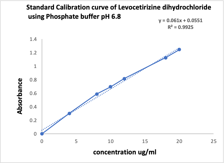Standard calibration curve of levocetirizine dihydrochloride was prepared by dissolving accurately Weighed 100 mg of levocetirizine dihydrochloride in 100 ml volumetric flask and the volume was made up to 100 ml by using phosphate buffer pH 6.8 solution to obtain a stock solution of 1000 µg/ml (SS-I). From this stock solution, 1 ml withdrawn and diluted with 100 ml by using phosphate buffer pH 6.8 to obtain a stock solution of 10µg/ml (SS-II). Different aliquots of levocetirizine dihydrochloride in the range 1-10 ml were pipetted into different 10 ml volumetric flasks and volumes were made up to 10 ml with phosphate buffer pH 6.8 to get the concentration of 4, 8, 12, 16 and 20µg/ml. The absorbance of these drug solutions were measured at 230.1 nm. The calibration curve was plotted as concentration v/s absorbance.
