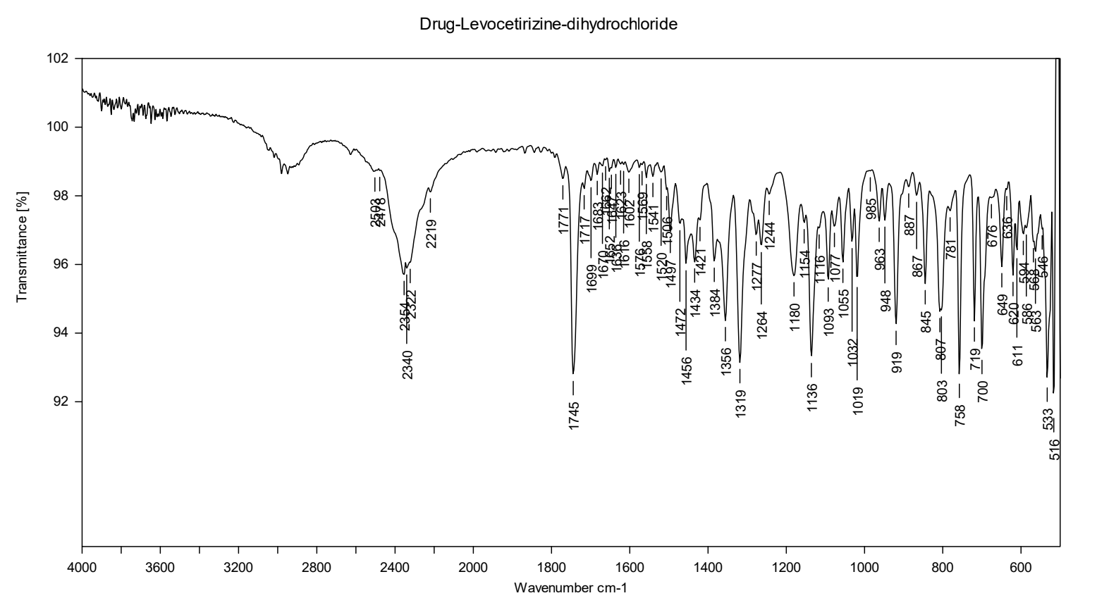 The solution of levocetirizine dihydrochloride containing a concentration 10µg/ml was prepared using phosphate buffer pH 6.8 and UV spectrum was taken using Elico spectrophotometer. The solution was scanned in the range of 200-300. The absorption maximum was found to be 230.1 nm.