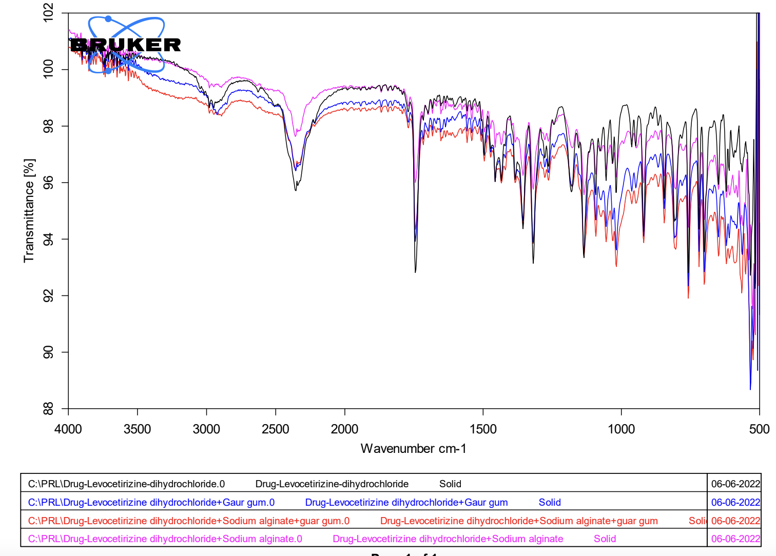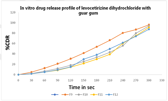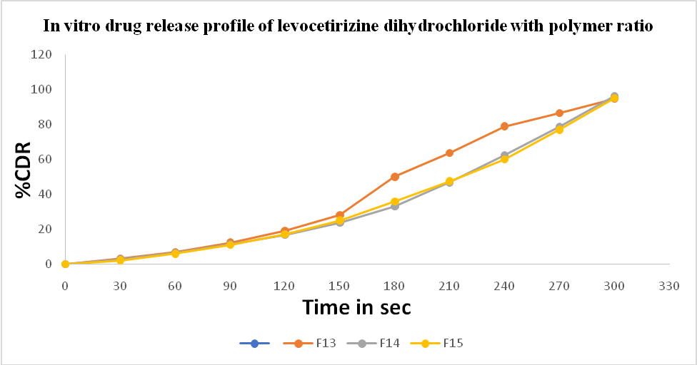 Based on the above studies, following conclusions can be drawn The FTIR studies indicated that there was no interaction between the drug and the polymers and their used in the dosage form. Hence, they are compatible with each other and thus suitable for the formulation. Sodium alginate and guar gum as polymers to obtain desired film properties. Starch is used as disintegrant. Citric Acid was used as a Saliva stimulating agent to increase the rate of production of saliva that would aid in the faster disintegration. Mannitol was used as a Sweetener. Glycerol was used as plasticizer for enhancing mechanical property i.e., tensile strength. Based on the in vitro disintegration time and dissolution studies formulation F6 containing (10.4%) polymer concentration were found to be promising and showed a disintegration time 14.28±1.52 sec and drug release profile 98.24% respective, when compared to the other formulations. Finally, it was concluded that the MDFs of Levocetirizine dihydrochloride formulation containing natural polymer sodium alginate showed less disintegration time and in vitro drug release study faster than the other formulations. Formulations were found to be complying with all the properties of films and the formulations were satisfactory.