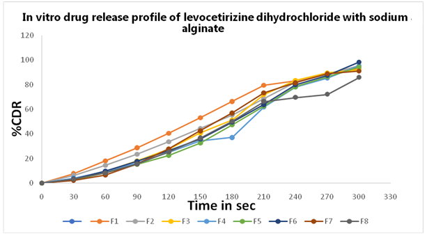 Conclusion: From the results, it was concluded that the Mouth dissolving films of Levocetirizine dihydrochloride containing natural polymer sodium alginate (F6) showed the least disintegration time (14.28 sec), highest dissolution rate (98.24%) than the formulation containing natural polymer guar gum and combination ratio of (Sodium alginate: guar gum).