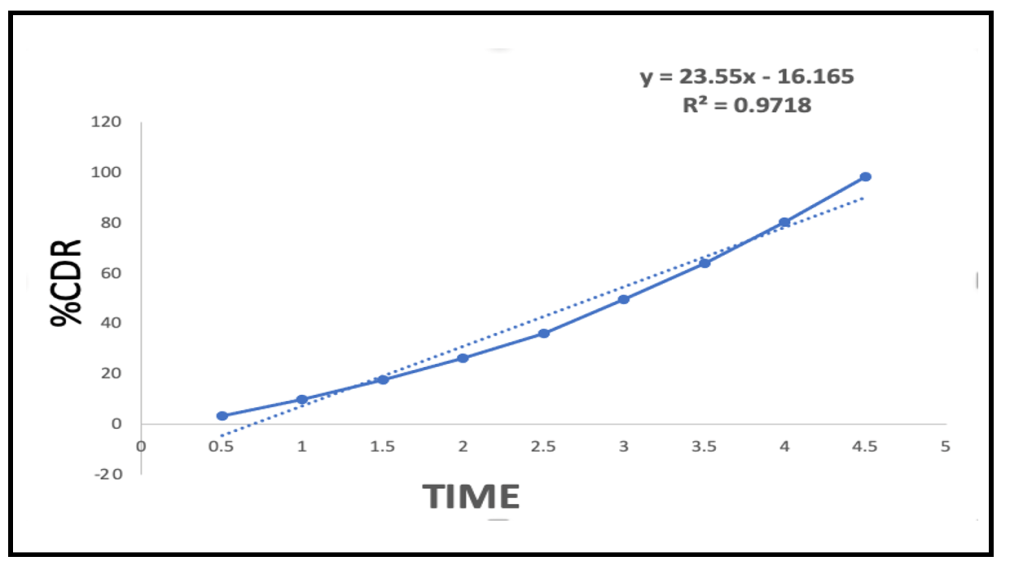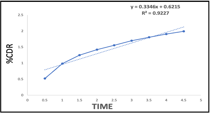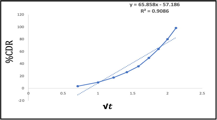 The linear regression coefficient of each kinetic model was calculated and the pattern of drug release from the dose was predicted. It was found that the optimized formulation F6 follows a zero order kinetic model as it has the highest R2value with the Korsmeyer–Peppas mechanism. The “n” exponent value of the optimized batch was found to be 1.526.