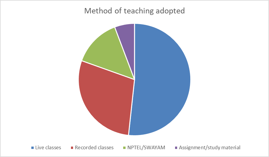 The questionnaire included questions about the modes and online tools that were used for the online classes and the preferred modes which provided a user interface which was easy to use and provided better tools for easy learning. With the initiation of online education, there was a boom in IT sector and a numerous number of online tools and applications were introduced which served in providing recorded lecture sessions, online live classes, study materials and a variety of certification courses. Various platforms were used like WhatsApp; Google meet, Zoom, Webex, YouTube, Microsoft teams, Sway am etc. WhatsApp and telegram were the most preferred in mass communication of information since these are very user-friendly and does not need any special technical skills to operate them. Students made use of either recorded sessions (75%) as it’s a better option considering network or other concerns making this an easily accessible option or live classes (25%). Classes were taken via presentations, digital content creation using animation and graphics etc. Initially, zoom was most commonly used application for online classes but later on zoom was found to be vulnerable to privacy and data security concerns thus google meet and Web ex came into play. Not only routine but seminars and informational sessions were also conducted regularly for upgrading knowledge and skills.