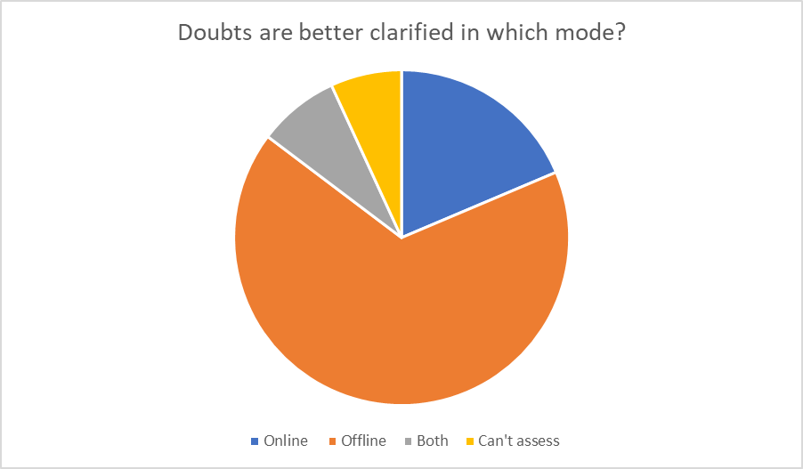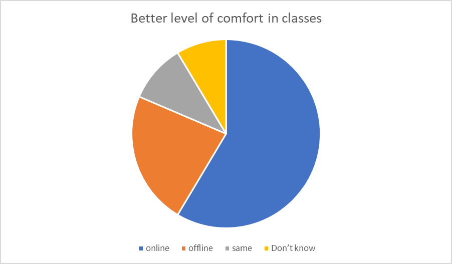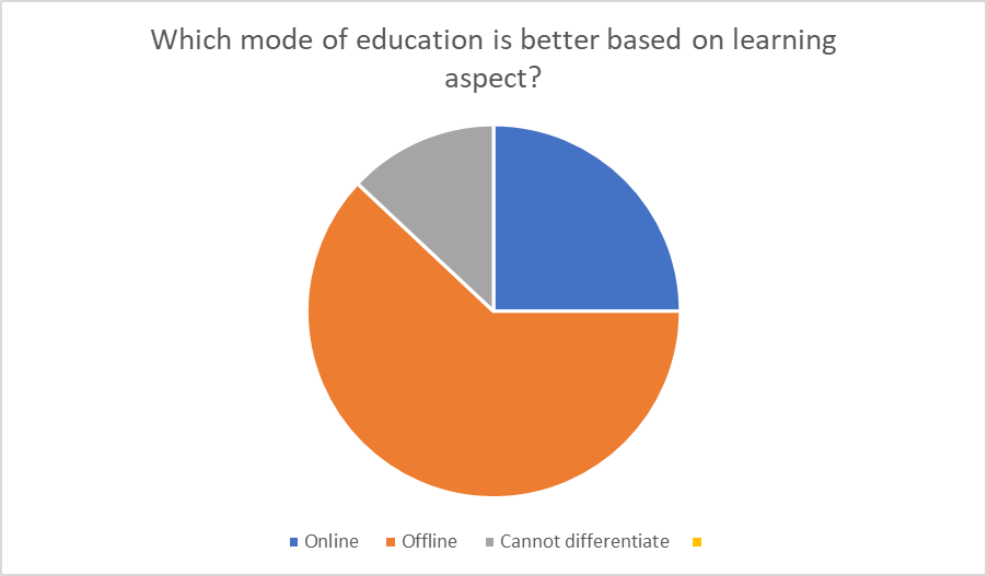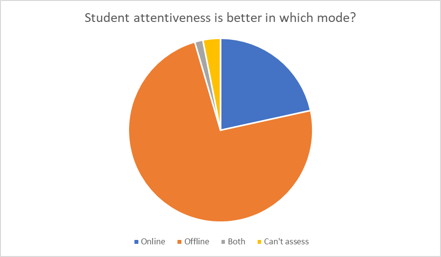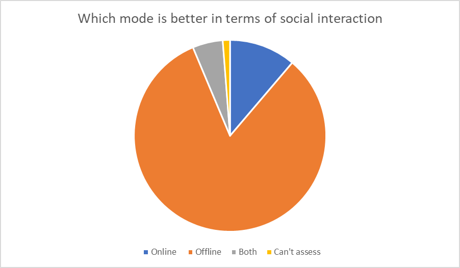 Though online classes opened a new door of knowledge transfer on a wider scale with a variety of technical inputs and tools, making them refreshing and interesting, like video learning, graphical representations, PowerPoint presentations, quizzes, meetings and conferences. However, a major disadvantage recognized in this mode is the lack of social interaction among the students and face-to-face interaction between the teachers and students. This is a major setback and the majority of respondents feel direct interaction and individual attention serves to play a vital role in the process of learning. Not only this but an interaction between the students helps them to develop interactive and social skills and aids their learning abilities. A majority of students responded that doubts and problems were solved and clarified in a much better way in offline classes. Some subjects were better covered in offline classes also elaborated discussions that included active participation from students was still conducted in a better manner in the later. In terms of participation and level of focus of students, though online classes seemed to be of great comfort yet the level of attentiveness in online classes was found to be low as per the response of the students. Although since the classes were attended from home, thus the participation and contribution of parents in the education process enhanced greatly as children were under direct attention and care.