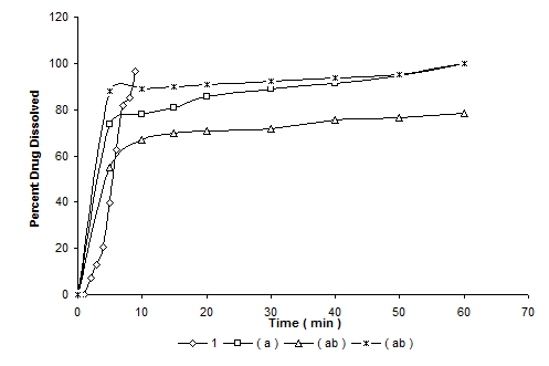 The aceclofenac - βCD – Kolliphor HS15 solid complexes (1,a,b,ab) were formulated into tablets by wet granulation method as per the formulae given in table 1. All the prepared tablets were tested for drug content, hardness, friability and disintegration time and dissolution rate of aceclofenac. The results are given in Tables 4-5 and Fig. 2. Aceclofenac content of the tables was within 100± 2% of the labeled claim. Hardness of the tablets was in the range 6.0-7.5 Kg / cm2. Percentage weight loss was less than 0.65% in the friability test. All the tablets formulated employing inclusion complexes disintegrated rapidly within 3.5 min.