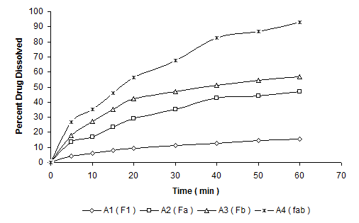 Tablets Faand Fb formulated respectively with βCD and Kolliphor HS15 alone gave 4.75 and 6.1 fold increase in the dissolution rate when compared to control tablets F1 formulated with aceclofenac pure drug. Tablets Fab containing drug - βCD -Kolliphor HS15 complex gave much higher enhancement (21.35fold) in the dissolution rate when compared to control formulation F1 and also formulations Faand Fb. Thus combination of βCD and Kolliphor HS15