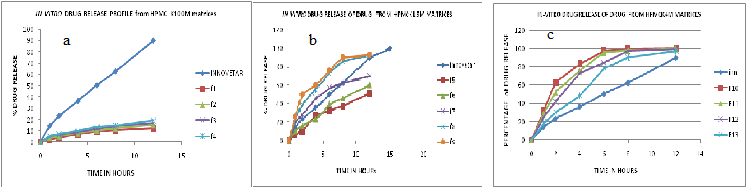 Fig. 2:a) In-vitro drug release profiles of fluvoxamine from HPMC K 100M Matrices b) In-vitro drug release profiles of fluvoxamine from HPMC K15M matrices c) In-Vitro drug release profiles of fluvoxamine from HPMC K4M matrices