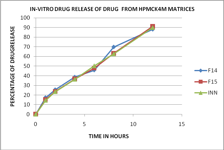 In this formulation HPMCK4M used to retard the drug release. As shown in the table 9 and fig. 2 HPMC K4M used in different percentages in F10, F11, F12, F13, F14, and F15 formulations. Started with 1% of polymer in F10, which shows burst release of drug, concentration is increased in order 3% in F11, 6.18% in F12, 9.2% in F13 and 12% in F14 which shows better control in drug release. In order to get exact optimization of drug release and to match with the inventor product the concentration of polymer is further increased to 15% which showed 91.2% drug released in 12hr. where complete erosion of matrix occurred. So this formulation was considered as optimized formulation.