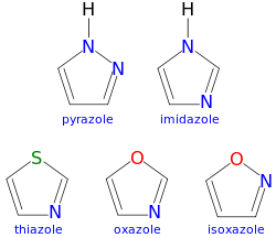 The azoles are classes of five-membered nitrogen heterocyclic ring compounds that contain at least one other non-carbon atom of nitrogen, sulfur, or oxygen [11], as showed in fig. (1). The parent compounds are aromatic and have two double bonds with fewer one and only one ion pair of electron from each heteroatom in the ring [11]. The numbering of ring atoms in azoles starts with the heteroatom that is not part of a double bond, and then proceeds towards the other heteroatom [11].