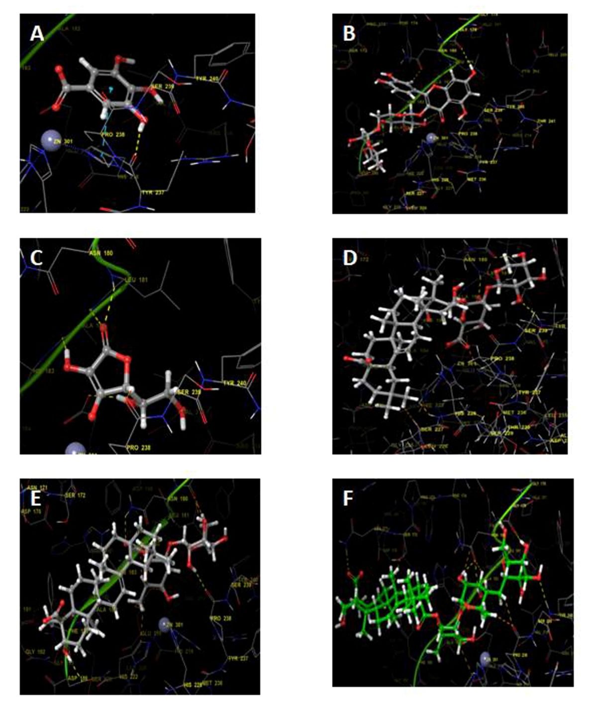 Fig. 1: 3D Interaction diagram with 1CGL (A) Gallic acid (B) Rutin (C) Ascorbic acid, (D) Celosin A (E) Celosin C (F) Celosin D