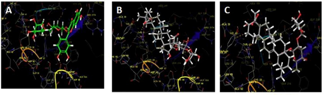 Fig. 2: 3D Interaction diagram with 1QNJ (A) Rutin (B) Celosin A (C) Celosin C