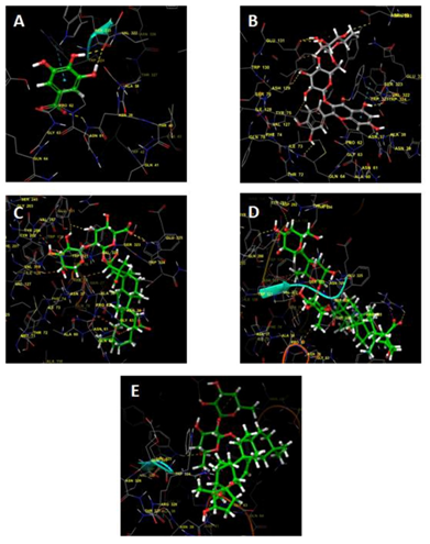 Fig. 3: 3D Interaction diagram with 2PE4 (A) Gallic acid (B) Rutin (C) Celosin A (D), Celosin C (E) Celosin D