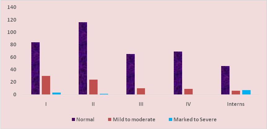 A total of 490 subjects were approached of which 470 participated in the study with a response rate of 95.9% of which males 217(46%) and females 253 (54%) (table 1). The mean age of the subjects was 20.90 y. The overall prevalence of Internet Addiction is 36.3%. The prevalence among 1st-year subjects was 24.8%, 2nd-year subjects were 18%, 3rd y subjects were 16%, 4th y subjects were 15% and interns were 26.2% (table 1). The prevalence of Internet addiction among males was 46.17% and among females was 53.8%. The study’s overall prevalence of anxiety was 19.14%. The prevalence of anxiety was 28.2% in first-year students, 17.7% in second-year students, 13.3% in third-year students, 11.5% in fourth-year students, and 22.3% in interns (table 2) (fig. 1, fig. 3). Males were more likely than females to experience anxiety (42% versus 37%). The prevalence of Anxiety in subjects with Internet Addiction was significant statistically (p<0.0001), with 31% of subjects with Internet addiction having Anxiety (table 3 and table 4).